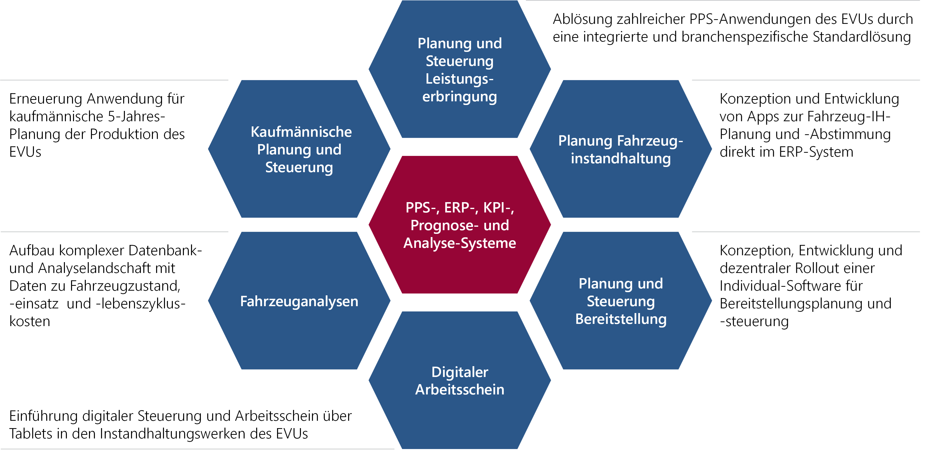 Für eine effektive Beratung unserer Projekte im Schienenverkehr setzen wir auf unsere fundierten Fachkenntnisse vor allem in den Bereichen Umlaufplanung, Planung und Steuerung von Instandhaltung und Bereitstellung sowie der zugrundeliegenden Daten zum Fahrzeugzustand, Infrastrukturmodell sowie Laufplänen und Fahrten.